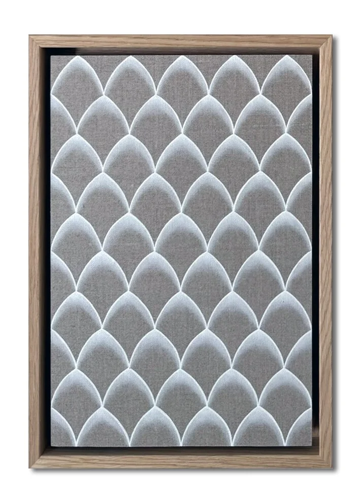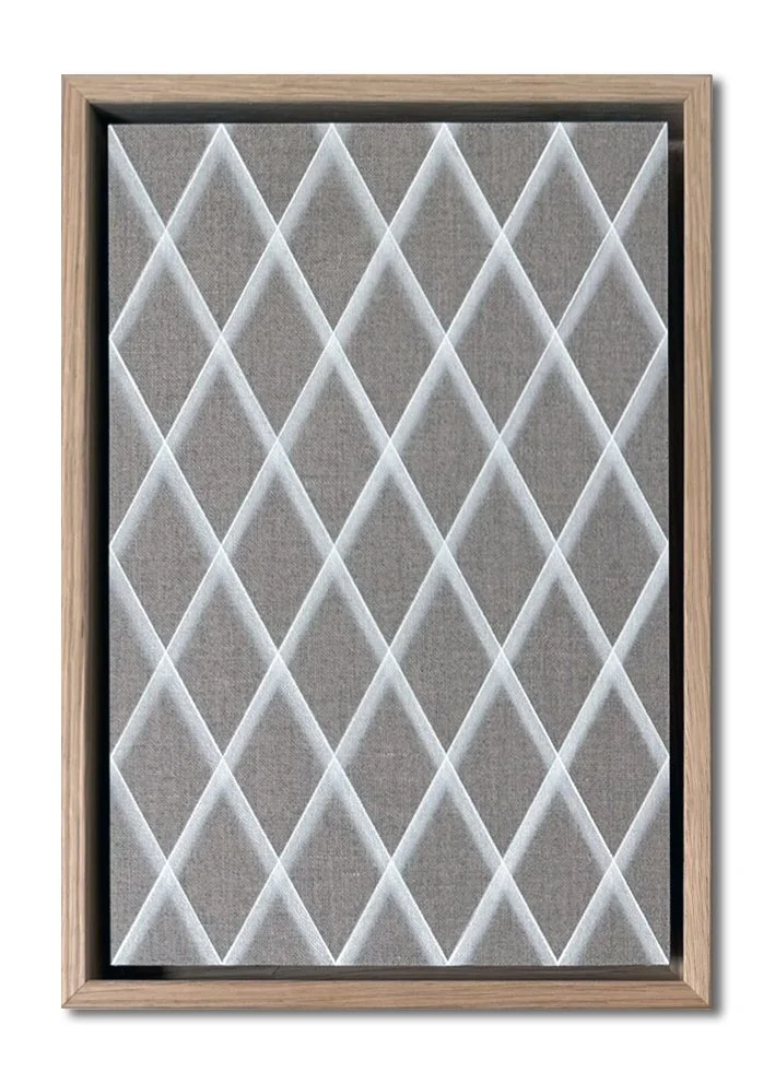 Auf Leinen gemalt, erhält das Werk eine besondere Haptik und Wertigkeit. Die natürliche Struktur des Materials unterstreicht die ruhige, reduzierte Formensprache